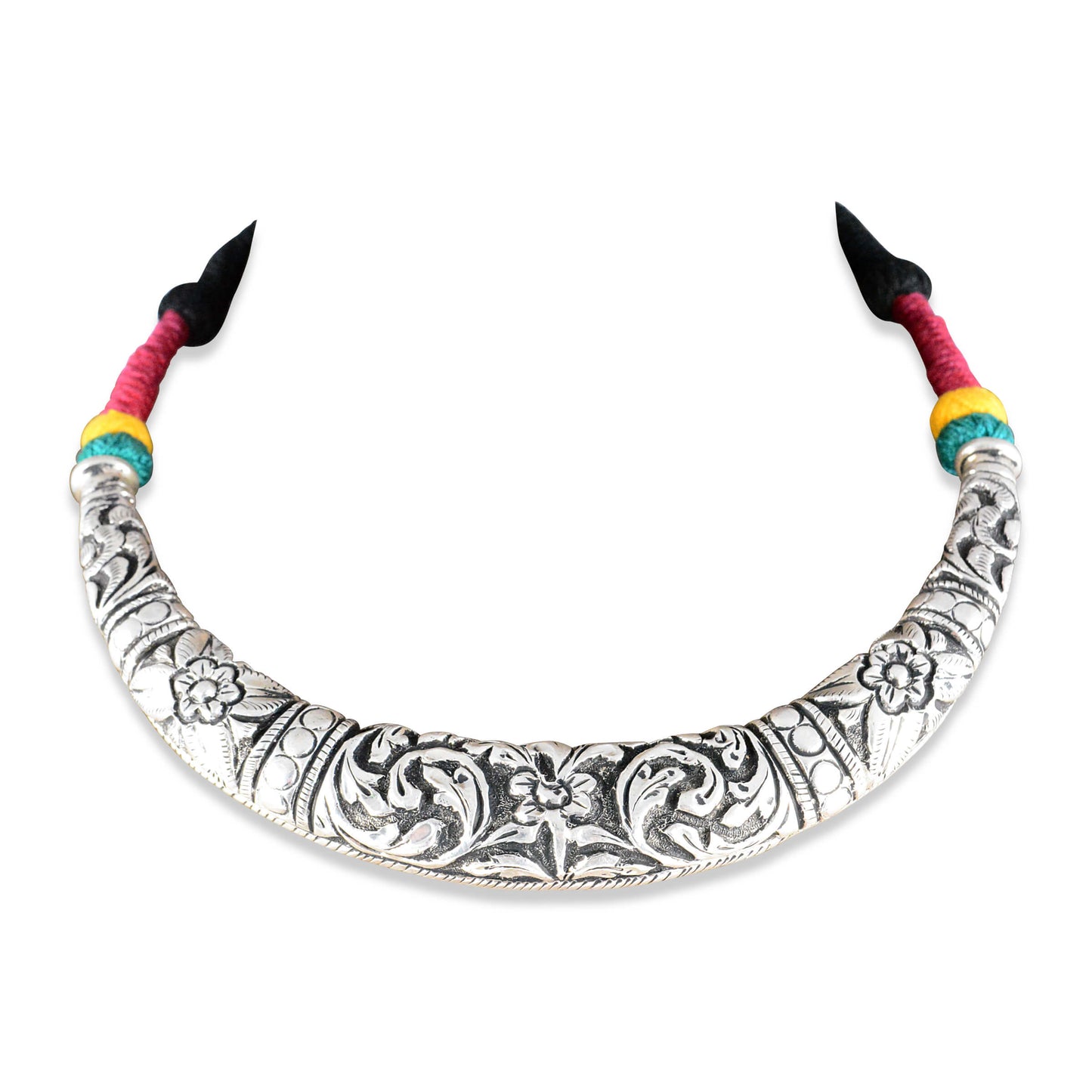 Made with 925 pure silver, Nakkashi Tribal Hasli is a handcrafted tribal piece giving your complete attire a bold look. This detailed floral carved necklace is bold sophisticated and complete in itself.