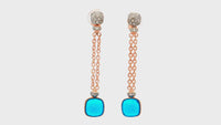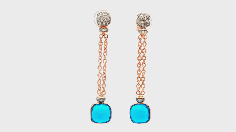 Enchanting dangle earrings crafted in radiant rose gold plated sterling silver, showcasing vivid blue, bottle cork cushion cut synthetic swiss blue toapz gemstones. The unique chain design adds graceful movement, perfect for elevating any ensemble with a touch of refined elegance.