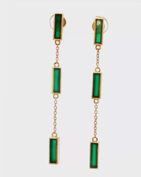 Elevate your style with these refined sterling silver dangle earrings. Each earring features three rectangular green onyx gemstones linked by delicate gold plated silver chains. The rich green hue of the emeralds offers a striking contrast against the warm tone of the gold, creating a sophisticated and modern aesthetic.