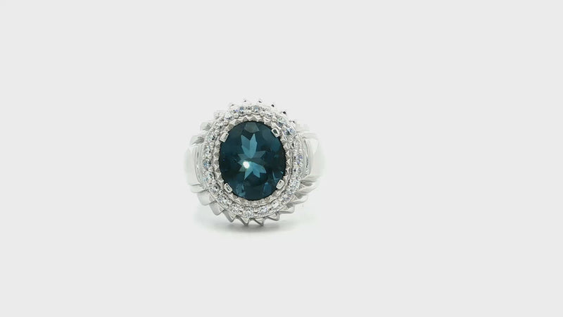 Exquisite silver multistone ring showcasing a mesmerizing oval cabochon cut london blue topaz. The design features meticulous craftsmanship, emphasizing the stone's smooth surface and rich color. This ring exemplifies elegance, perfect for adding a touch of sophistication to any ensemble.