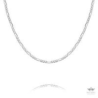 Bold and luxurious, the 1.5 mm diamond-cut solid sterling silver Figaro chain is a must-have piece for your jewellery collection. It exhibits a unique flat linked pattern comprising a solo rectangular link, interlocked with 3 other curb links. Each diamond cut link is intricately connected to create an impressive series, which welcomes light and sparkles from different angles. A robust layer of Rhodium is coated to protect the chain against tarnish and corrosion, while the mirror polish accentuates its natural shine. This durable and perfectly weighted Figaro chain is a piece of excellence and perfect for men. Wear this timeless classic every day to work or slay on special occasions. Crafted for both, women and men.