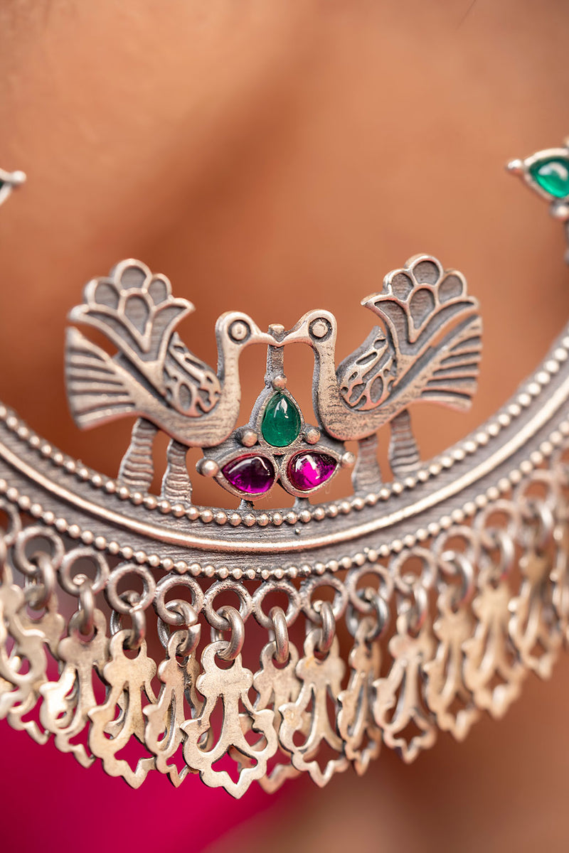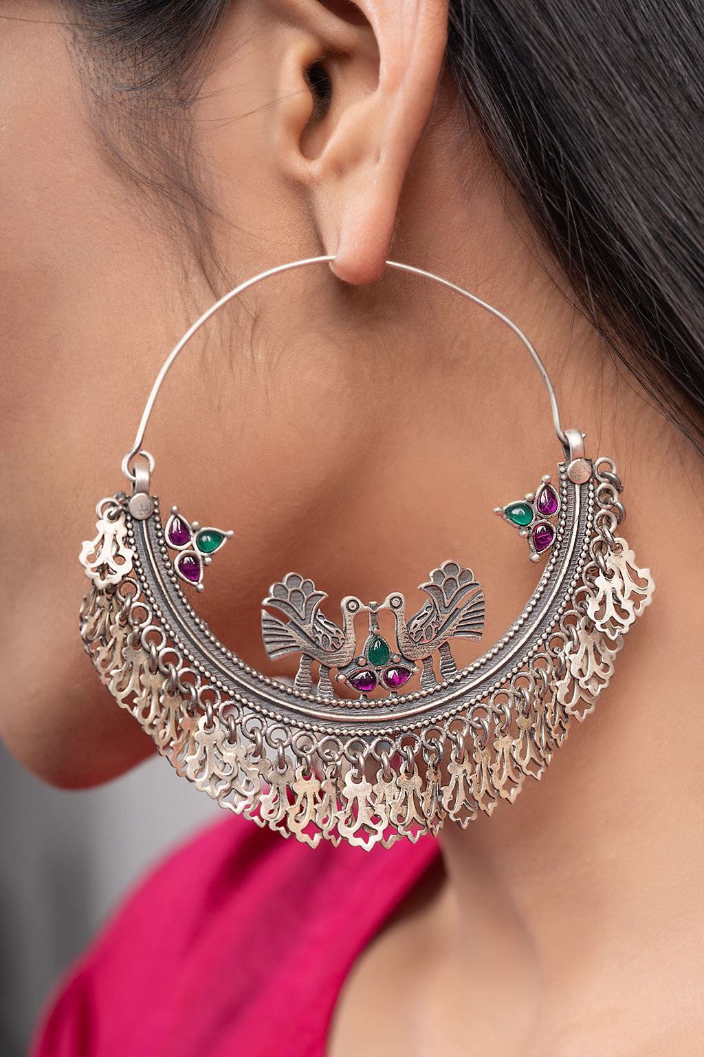 This earring is made with an elegant design of mayur with multicolored stones. This earring is made of 92.5 sterling silver with an oxidized finishing.