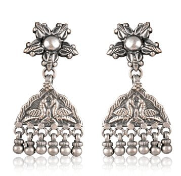 Silver Long Jhumki is formulated with a flower design on the top. This earning is crafted with pure 92.5 silver with an oxidised finish.