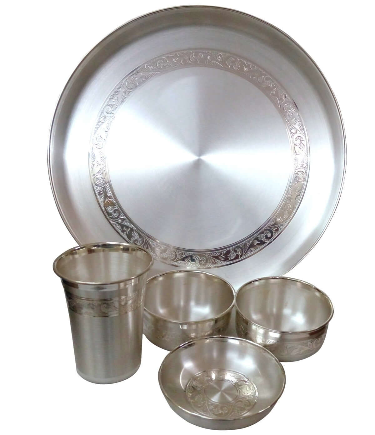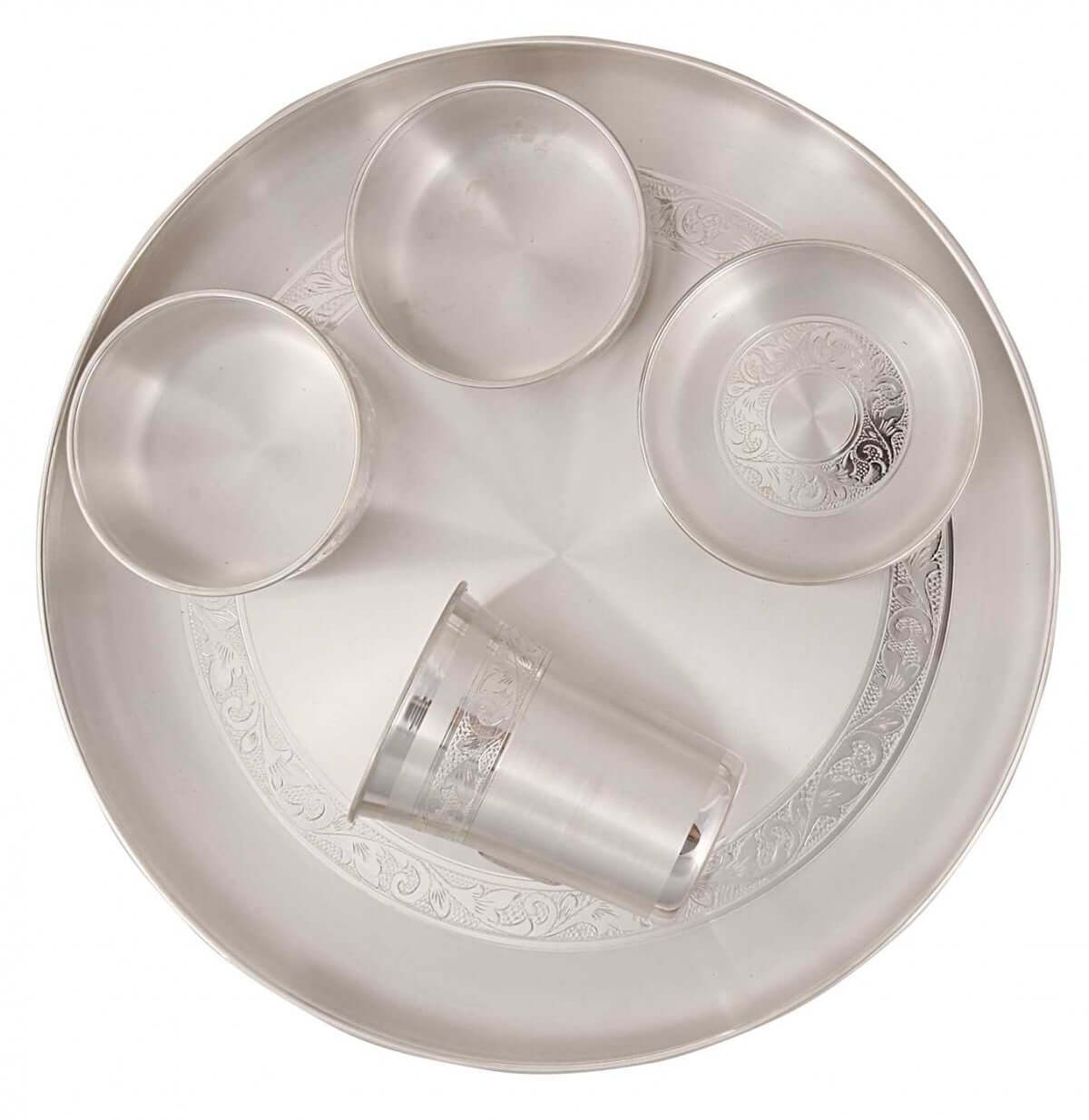 Being as the reputed organizations in the market, we are engaged in offering an excellent quality Silver Dinner Set. From our side, our offered articles are designed using supreme quality material and innovative technology under the guidance of our skilled personnel and weight for around 1207 grams. Owing to their salient features, our offered articles are widely used for gifting purpose. Moreover, our product can be availed by our clients at reasonable prices dimension: Plate - 31 cm Bowl - 1pc. 10 cm, 2pcs. 9 cm, Glass - 8 cm
