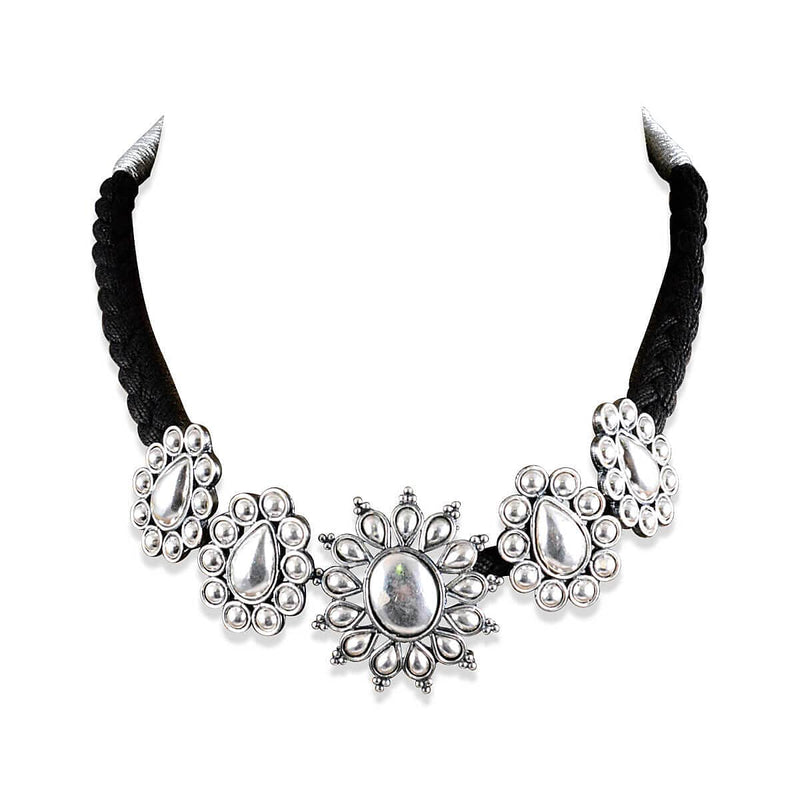 Based on the black pleated threads, Pushp Necklace, basically a choker is the epitome of fine contemporary art. Floral designs adorned with pure silver circle and oval elevations.