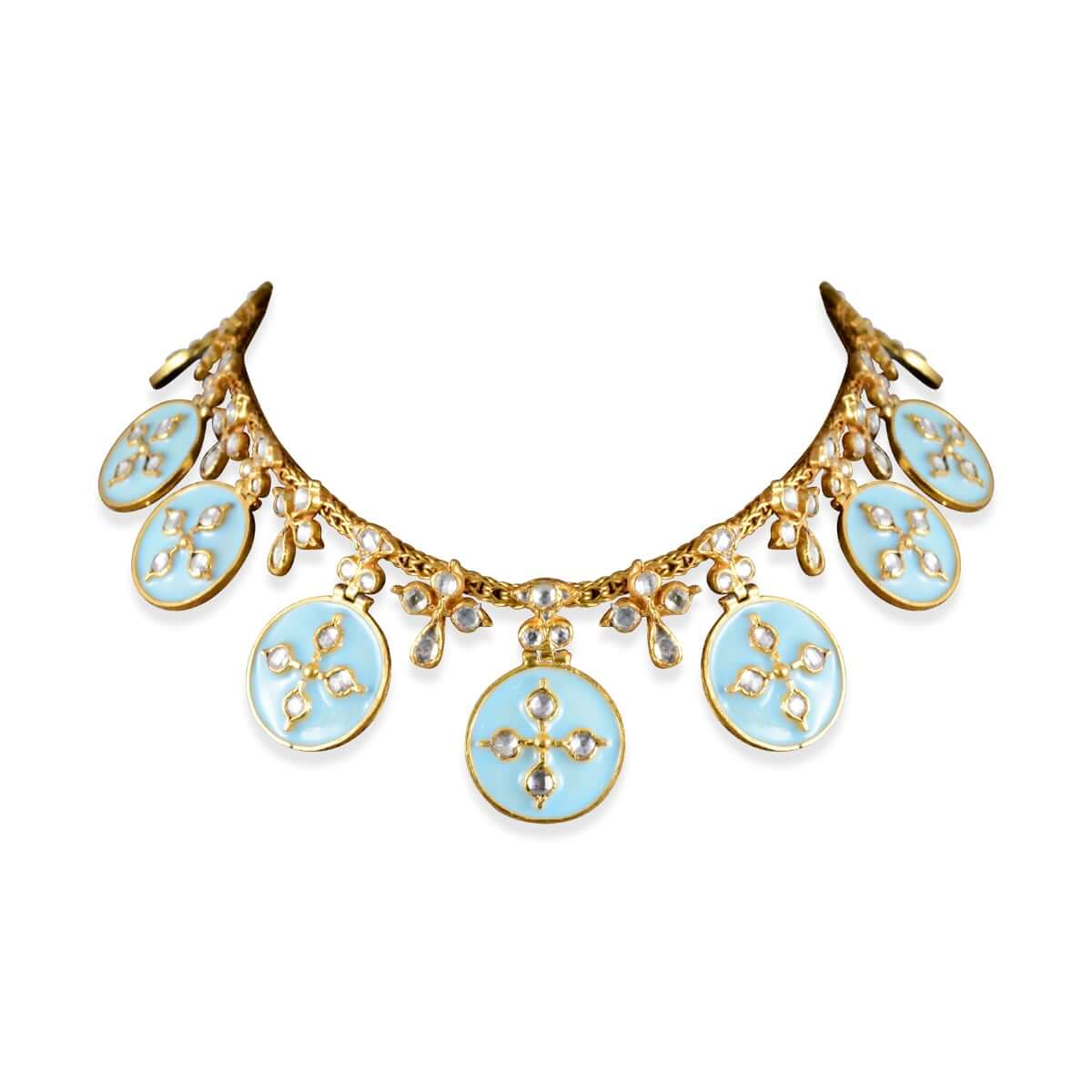 Appealing to every eye that crosses by, Firoza Kundan Necklace is a lavish art piece built with pure silver and concealed with fine blue meenakari work and gold polish. Perfect wedding piece.