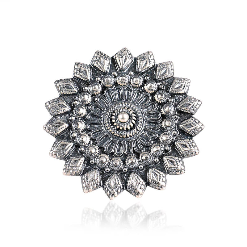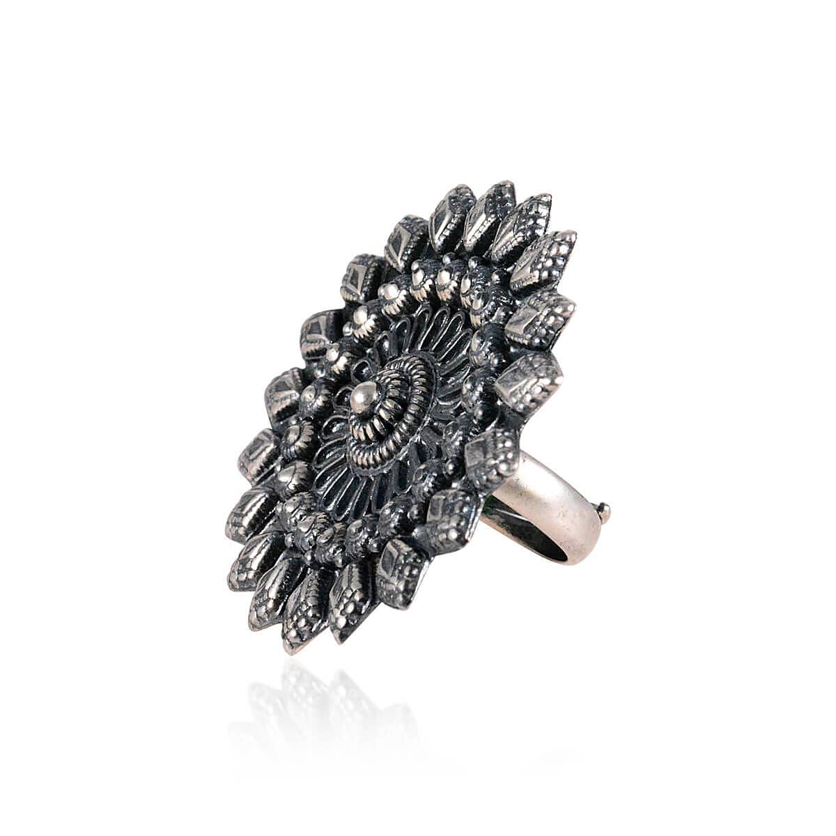 Black Onyx in the centre helps you master your destiny and gives you immunity from the negative energies. At the same time the floral silver design gives you an impeccable look that no one can match around you.