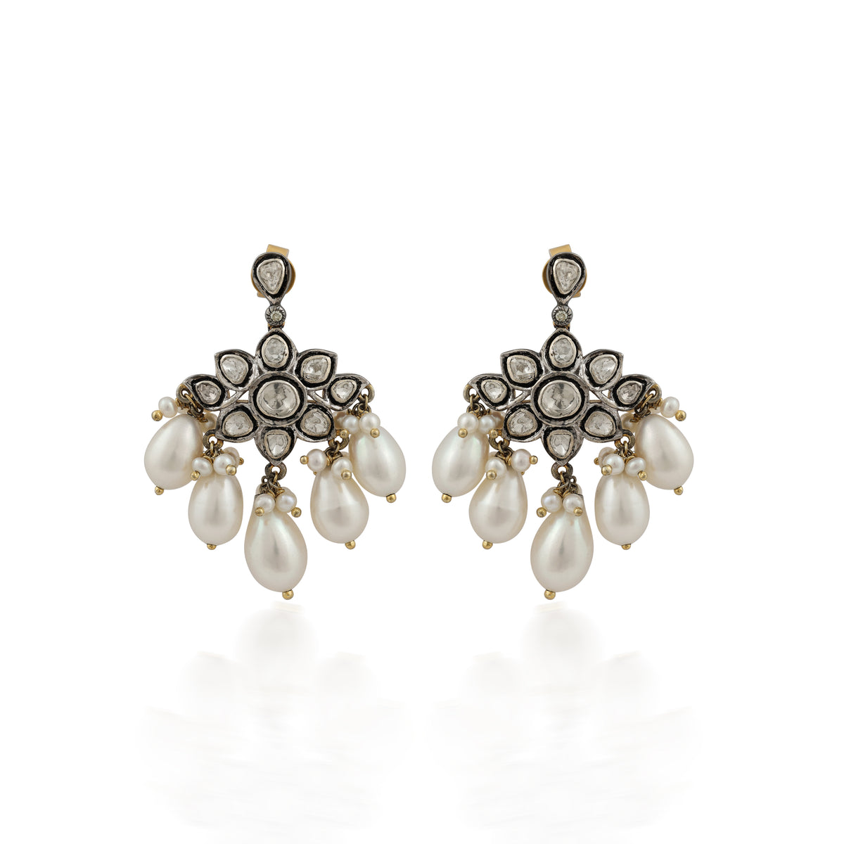 A pair of Noor Victorian Earrings is crafted for those who love the timeless beauty. The intricate floral motif, embellished with polki diamonds. Soft pearl drops will add the romantic movement, contrasting beautifully with the oxidised finish to create a piece both regal and soulful.