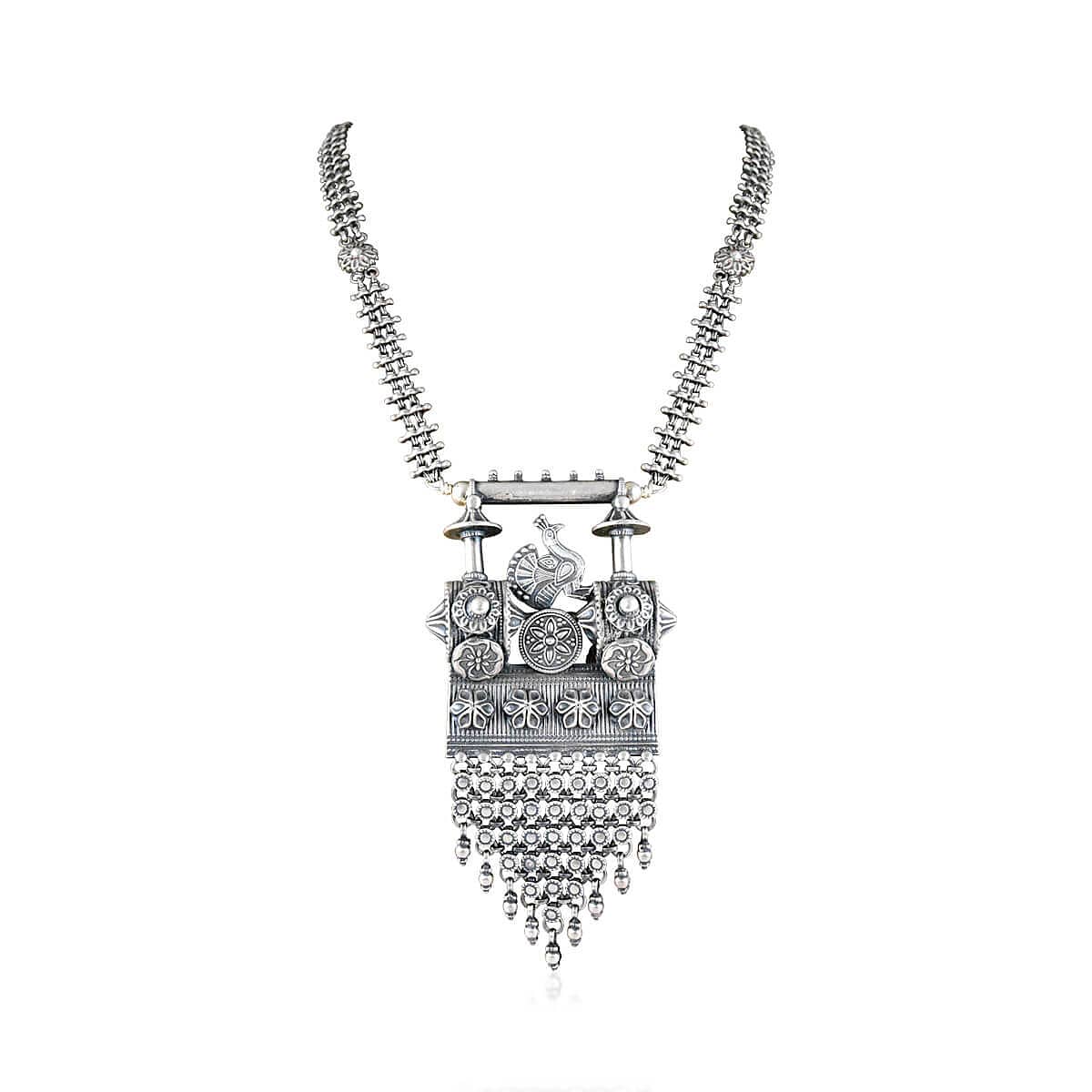 Peacock carving on the huge intricately designed pendant surely is the centre of attraction here. Pihu Tribal Necklace is the epitome of rich silver work adorning with an undetachable designer silver chain.