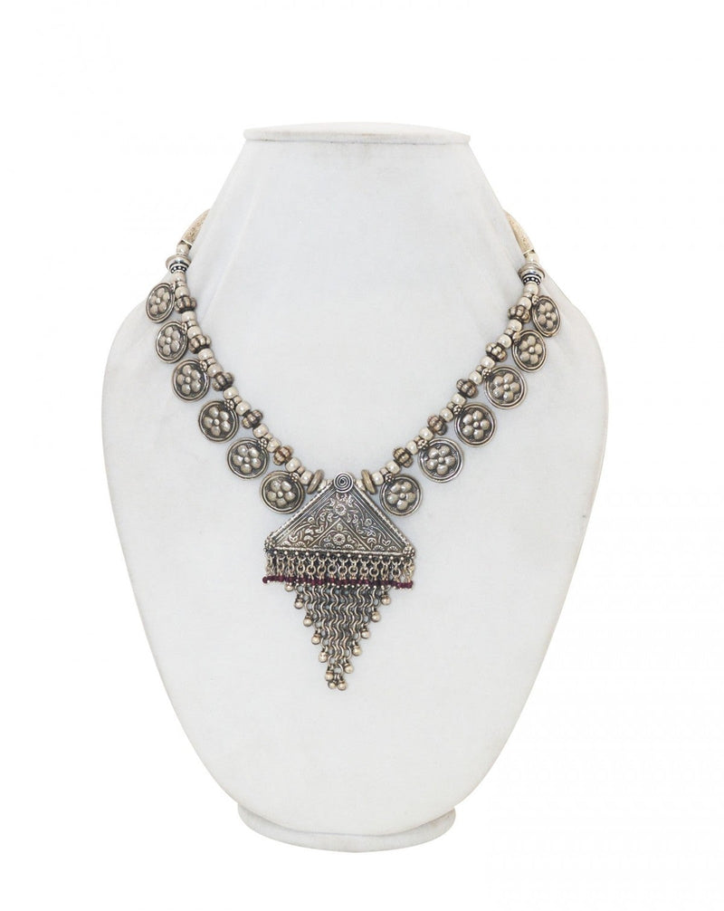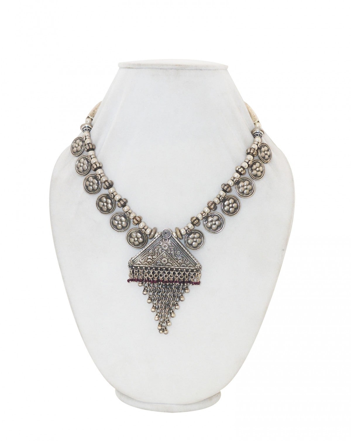 Oxidised Jhalar pendant beaded together with small flower pendants. Necklace is handcrafted in 92.5 % silver. Length of the necklace is about 26 inch