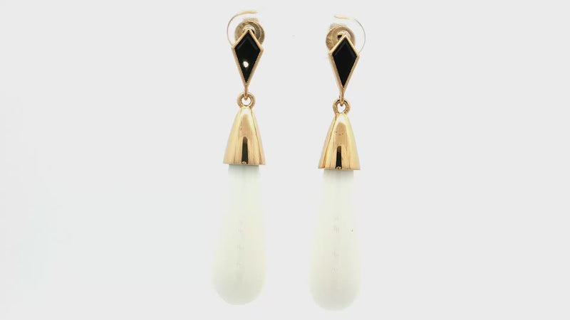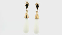 Elevate your style with these captivating dangle earrings, showcasing a lustrous white agate and black onyx suspended from elegant sterling silver settings. The earrings feature a timeless design, perfect for adding a touch of sophistication to any ensemble. These beautifully crafted earrings offer a refined accent that complements both casual and formal attire.