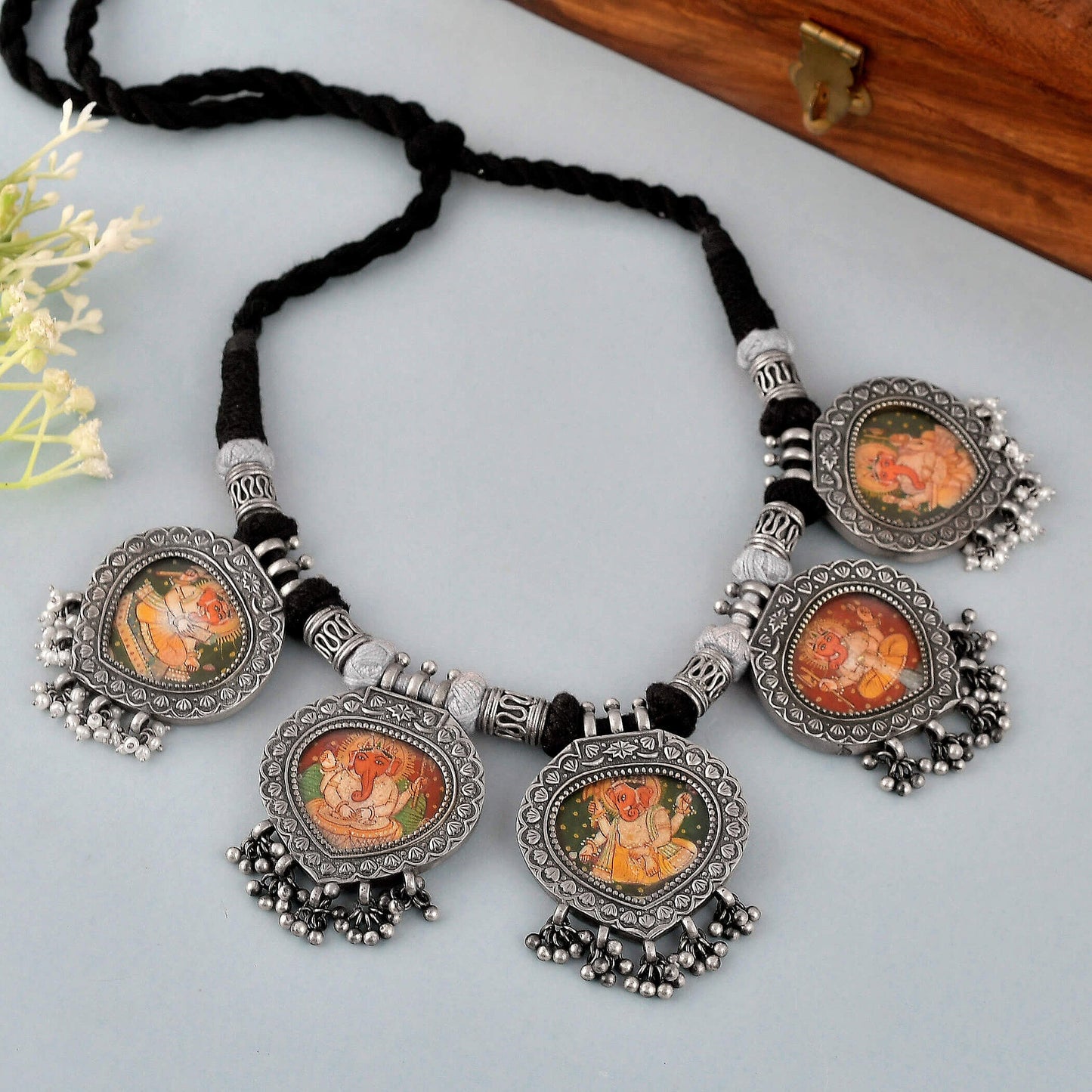 How about carrying miniature paintings as the epicenter of a necklace? This silver crafted Lord Ganesha Painting Necklace with finely carved silver leaf frames itself is a masterpiece you carry with your personality. This is a perfect necklace to be worn not just in religious functions but also in casual social gatherings as the circular silver handwork makes the piece an eyecatcher.