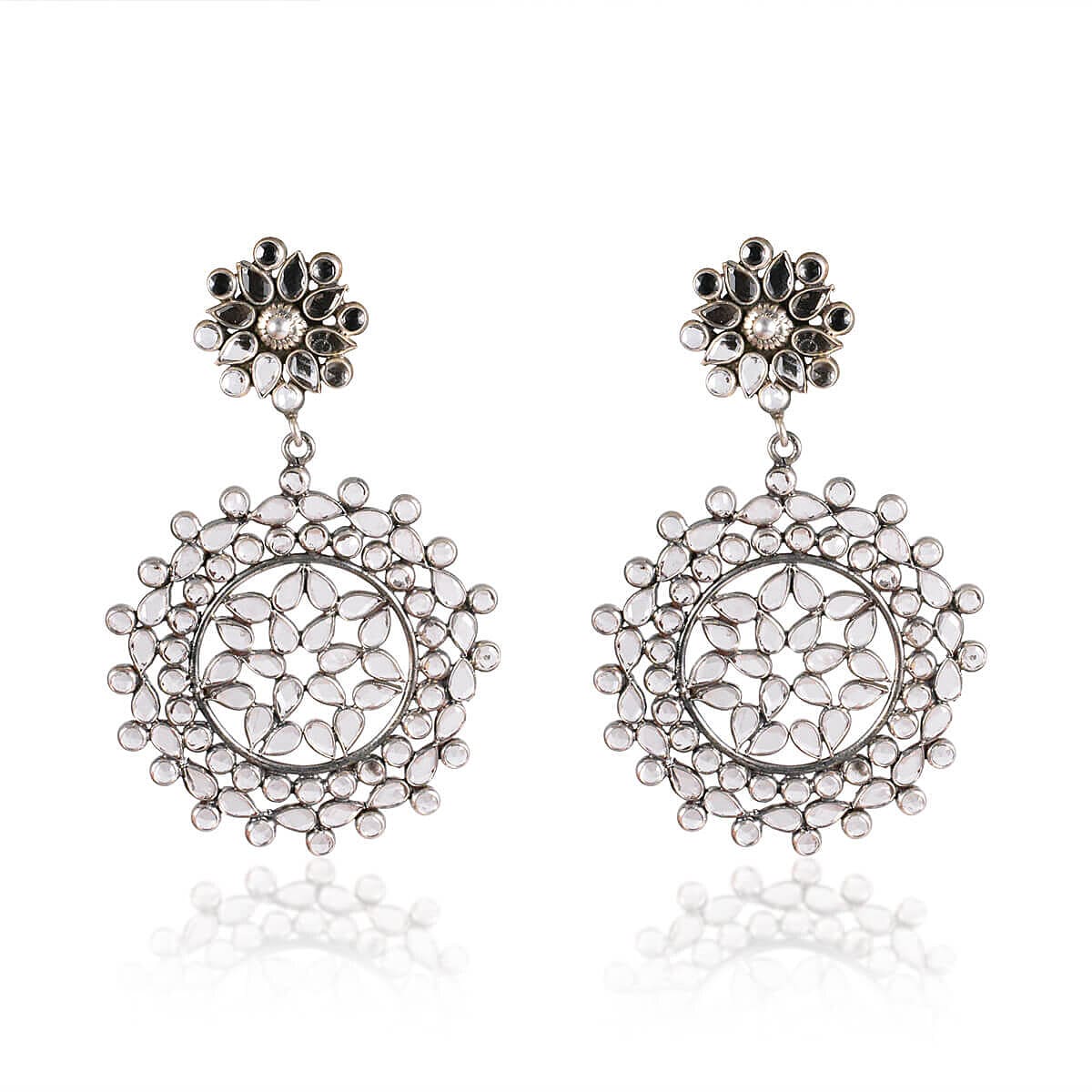 This earring is made with crystal stones along with sterling silver base material. This earring has exquisite designs with an oxidized finishing.