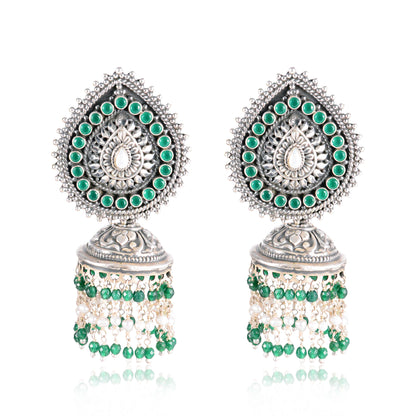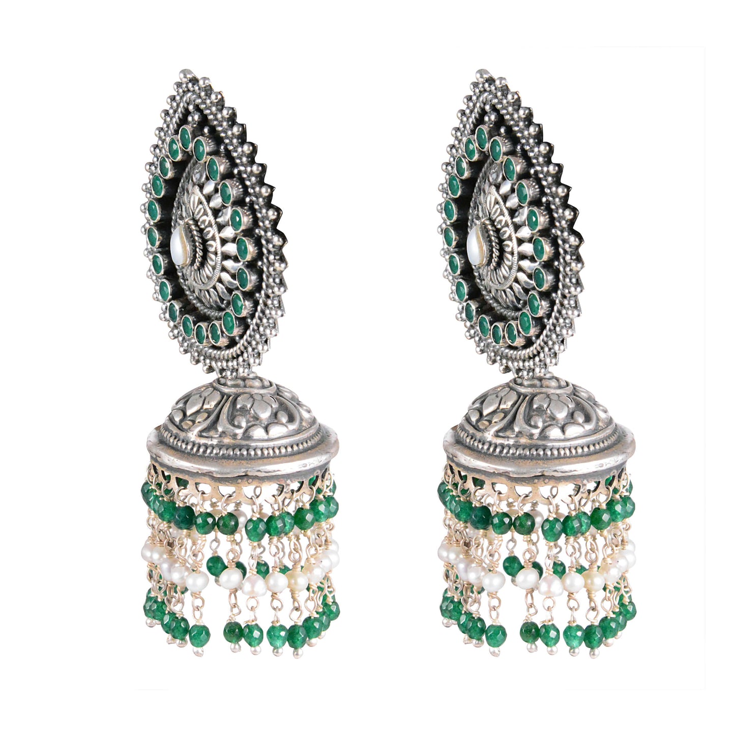 The timeless design of these green beaded silver jhumkas topped off with pearls makes it versatile to wear on all your traditional attires. The intricate hand carving can elevate your complete look.