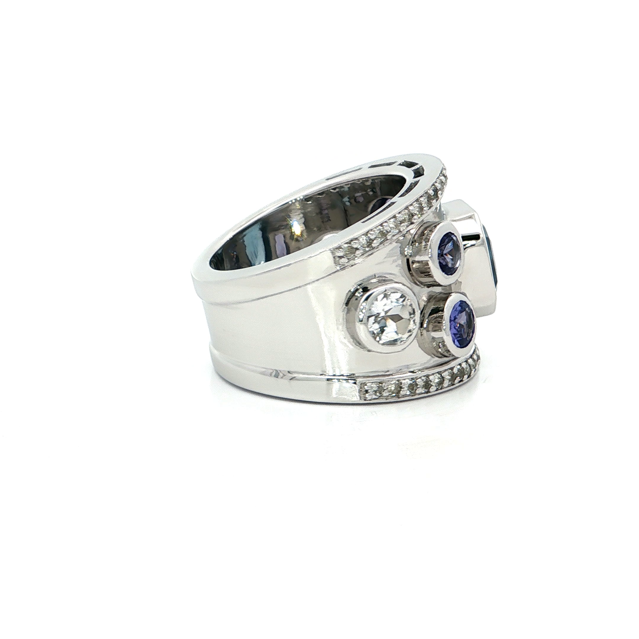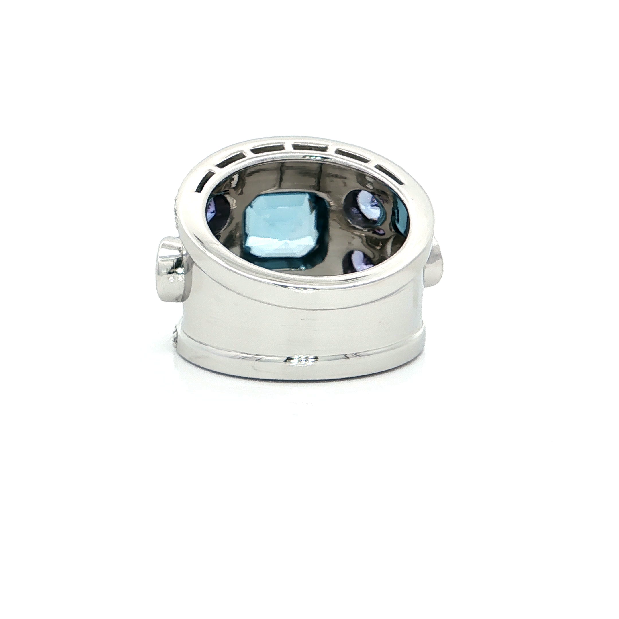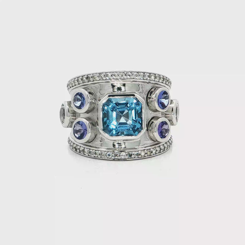 Make a statement with this bold multistone ring featuring a captivating square step-cut blue zircon as its centerpiece surrounded by round cut tanzanites. The ring is crafted in lustrous white gold plated silver, accentuating the blue hues of the aquamarine and additional accent stones. A standout piece that combines modern design with timeless elegance.