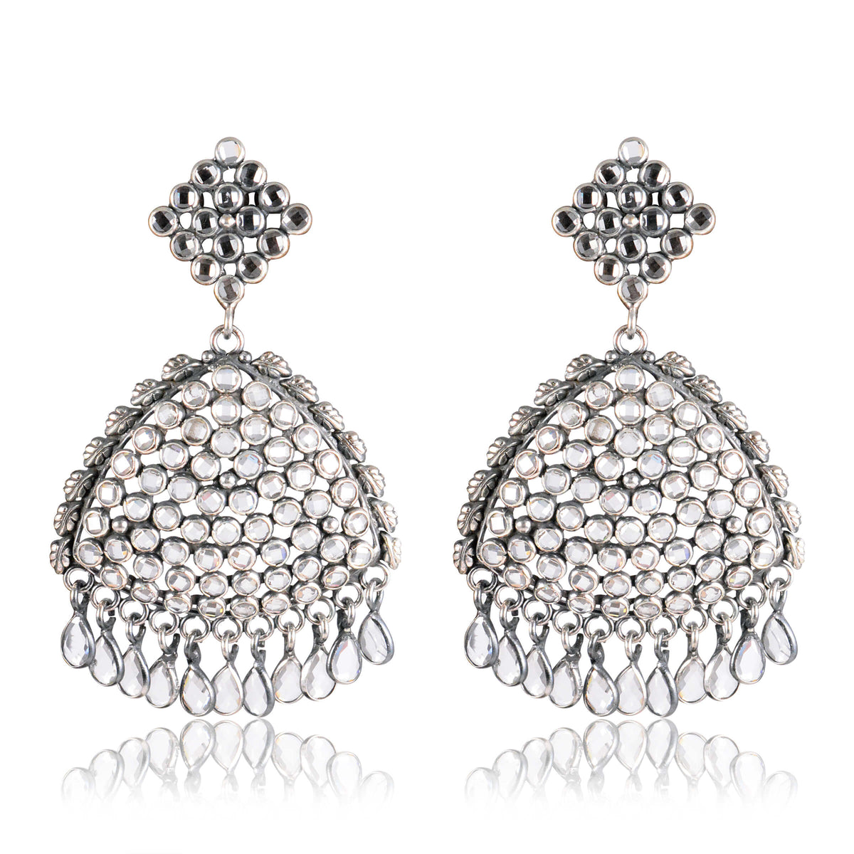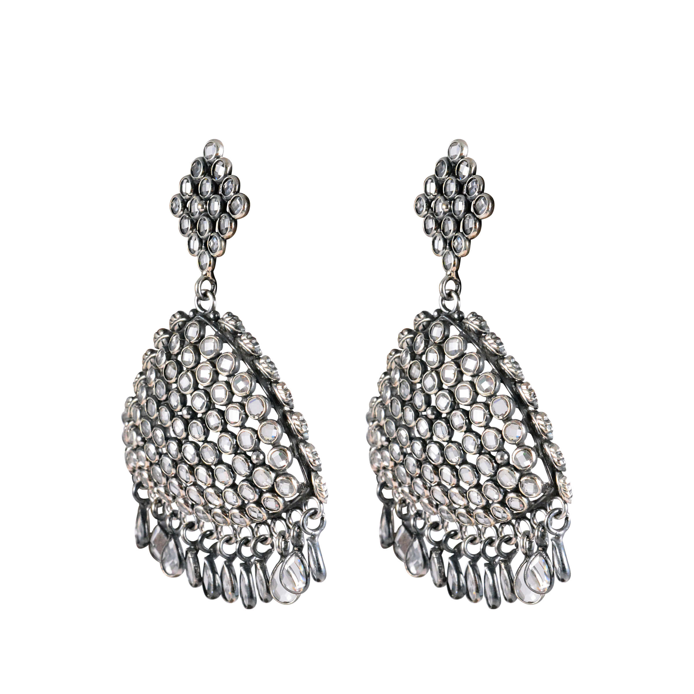 Complete your look with these pairs of vintage yet sheeny silver drop earrings. Perfect for ethnic gatherings or a formal party. Perfect with a silk suit or a bright stunning sarees as they complete the look.