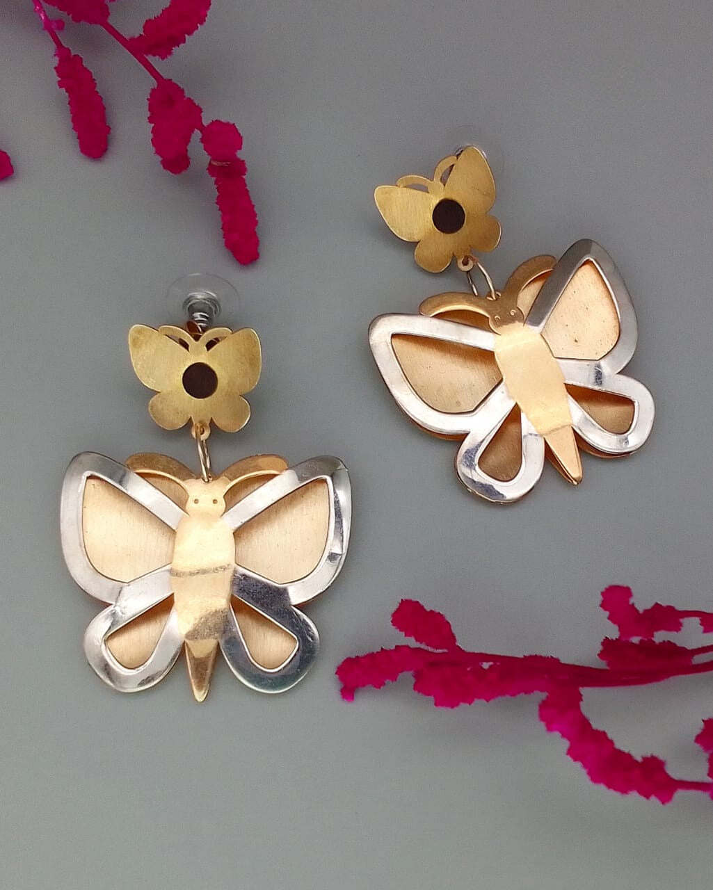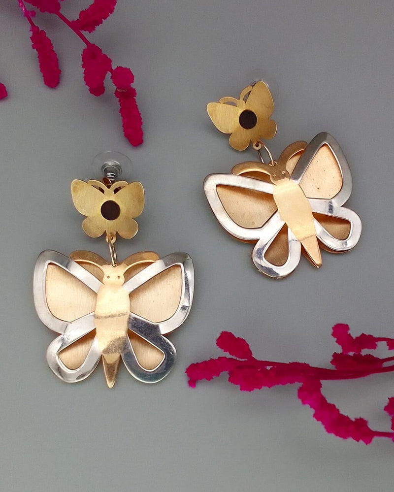 Give some edge to your ears with beautiful silver butterfly drop earrings. Half chopped silver metal earring with hidden butterfly to style your ears.