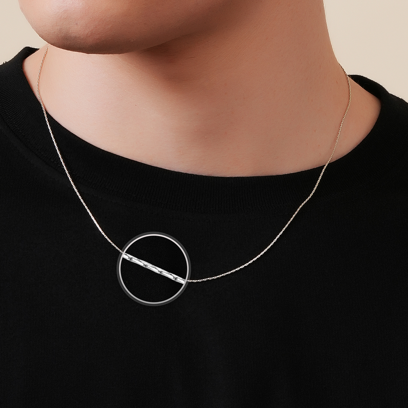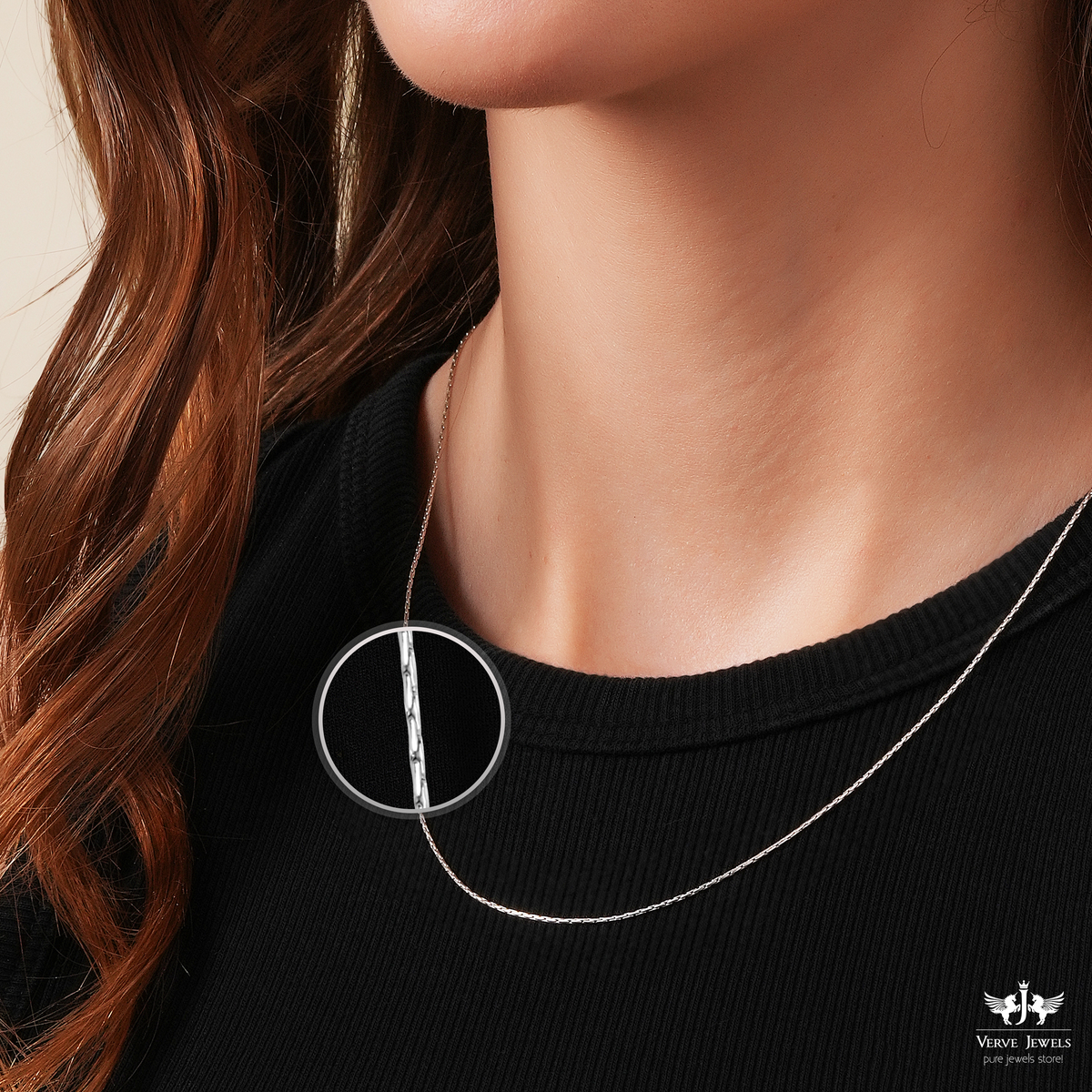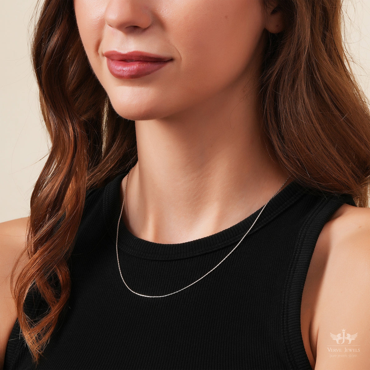The PNR Chain Necklace is a simple one, that's inspired by the elegance of clean lines and minimalist design. Whether you're dressing for a presentation or a weekend brunch, it's a delicate one that adds the right touch of sparkle. This 1mm width offers you a feather-light feel, what more could you ask for?