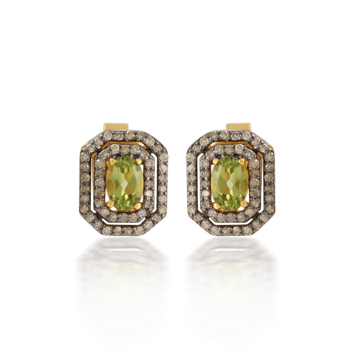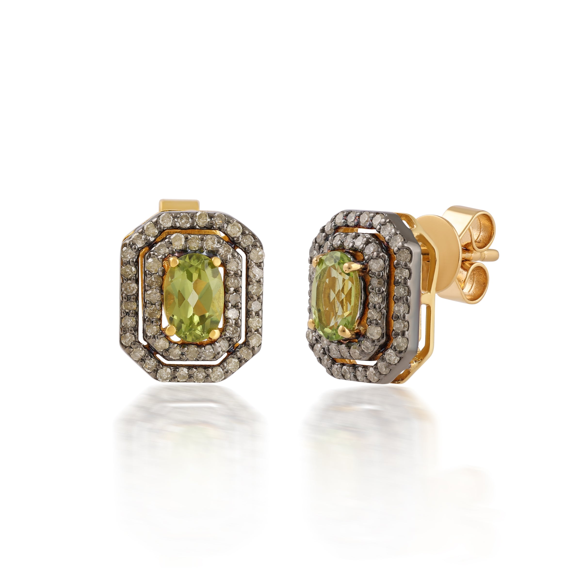 The Regal Halo Peridot Studs have a vintage charm with a modern edge. At the heart is a peridot gemstone, celebrated for its vibrant green hue. Framed by halos of pavé-set diamonds in a dark oxidised finish, these studs have a timeless glam with a bold twist.